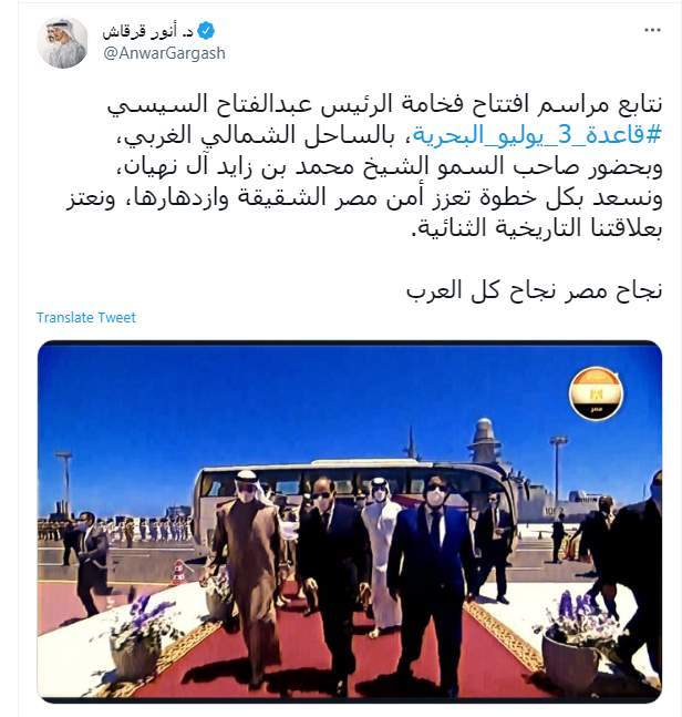 وكتب أنور قرقاش تغريدة على تويتر "نتابع مراسم افتتاح فخامة الرئيس عبدالفتاح السيسي #قاعدة_3_يوليو_البحرية، بالساحل الشمالي الغربي، وبحضور صاحب السمو الشيخ محمد بن زايد آل نهيان، ونسعد بكل خطوة تعزز أمن مصر الشقيقة وازدهارها، ونعتز بعلاقتنا التاريخية الثنائية.. نجاح مصر نجاح كل العرب"