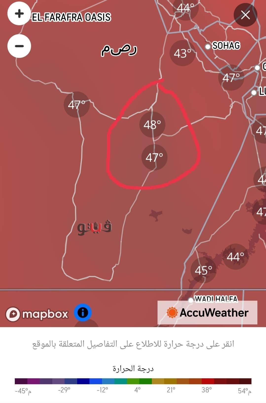 48 درجة بمنطقة الخارجة والفرافرة فيما سجلت المناطق الجنوبية بالمحافظة 49 درجة مئوية .
