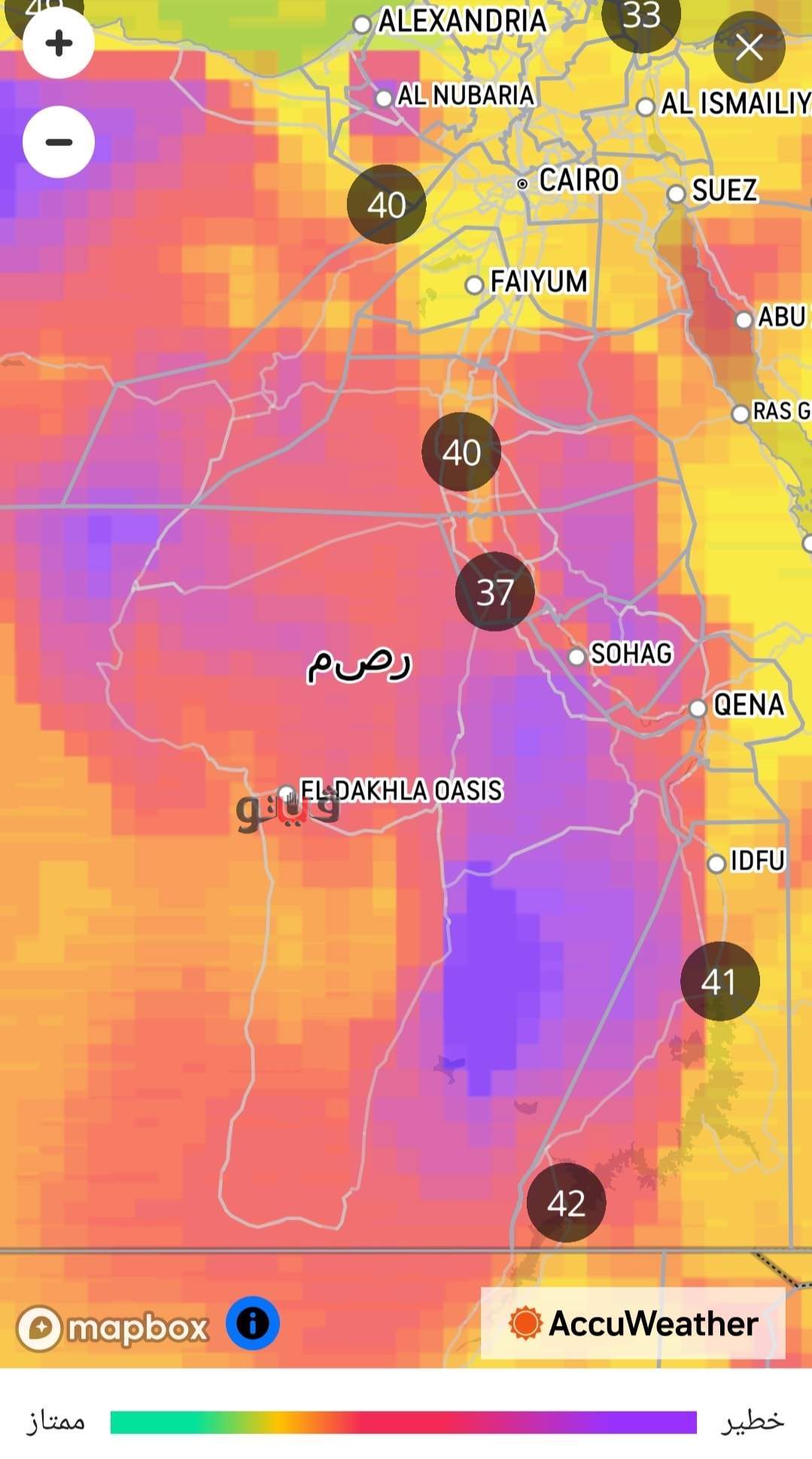 على جانب آخر أدرج موقع accuweather العالمي والمتخصص في اخبار الطقس والمناخ كلا من منطقة الخارجة وباريس والفرافرة باللون الأزرق على الخريطة وهو المؤشر الخطر وذلك بعد تخطى درجة الحرارة لـ٤٨ درجة مئوية وتسجيلها أعلى درجة حرارة على مستوى جمهورية مصر العربية .
