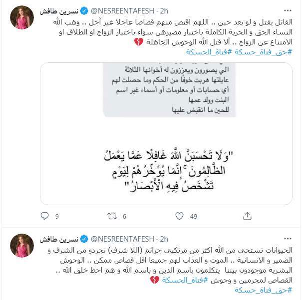 وكتبت نسرين طافش تغريدة على تويتر "الحيوانات تستحي من الله اكثر من مرتكبي جرائم (اللا شرف) تجردوا من الشرف والضمير والانسانية.. الموت والعذاب لهم جميعا اقل قصاص ممكن.. الوحوش البشرية موجودون بيننا يتكلمون باسم الدين وباسم الله وهم أحط خلق الله.. القصاص لمجرمين ووحوش #فتاة_الحسكة.. #حق_فتاة_حسكة".