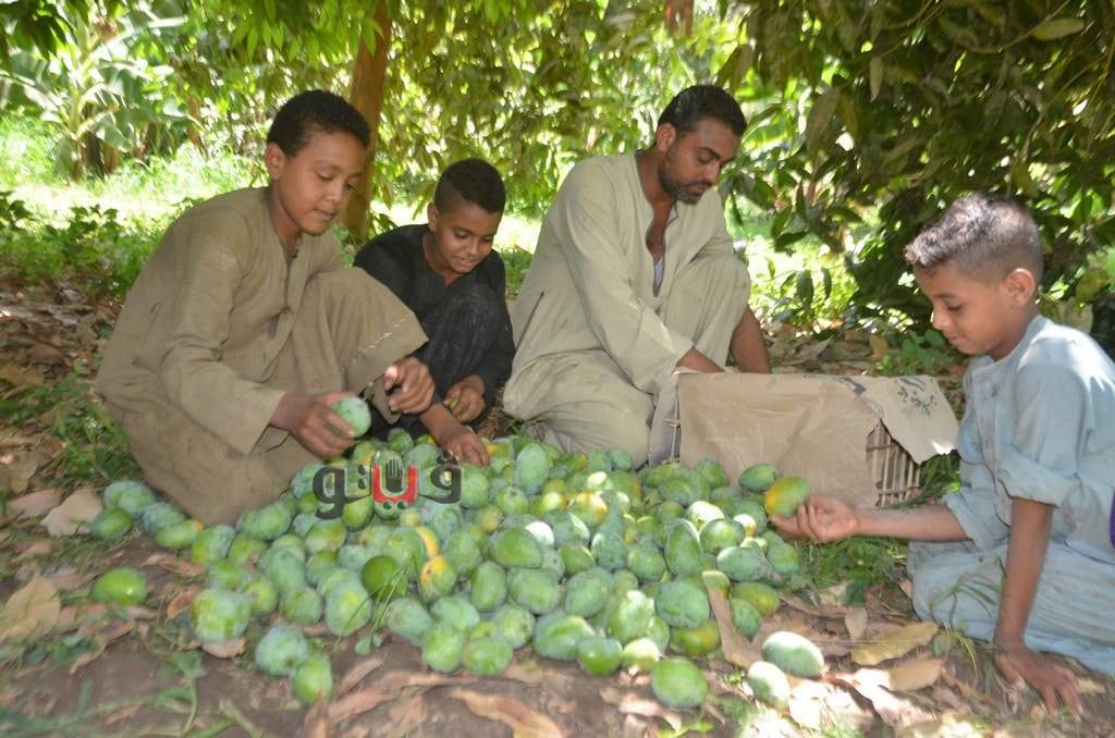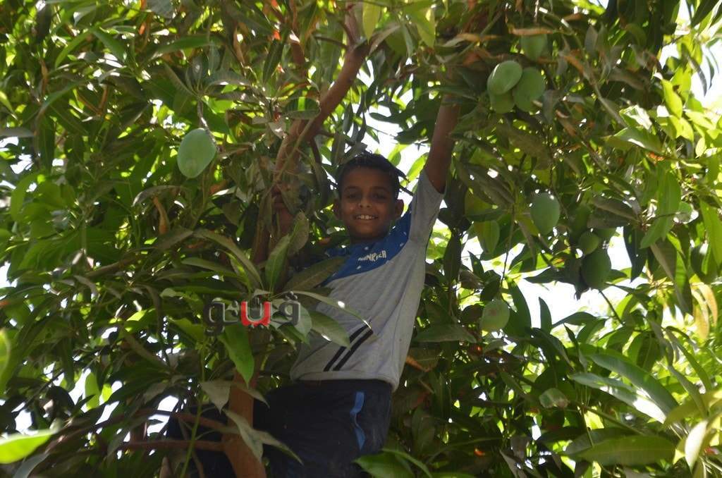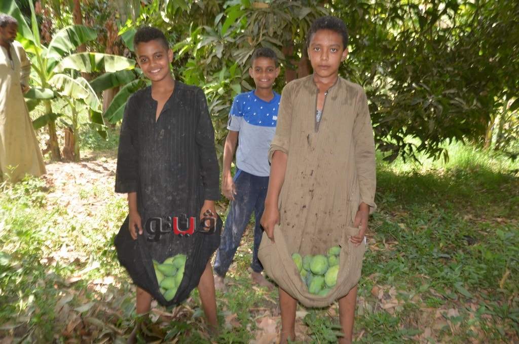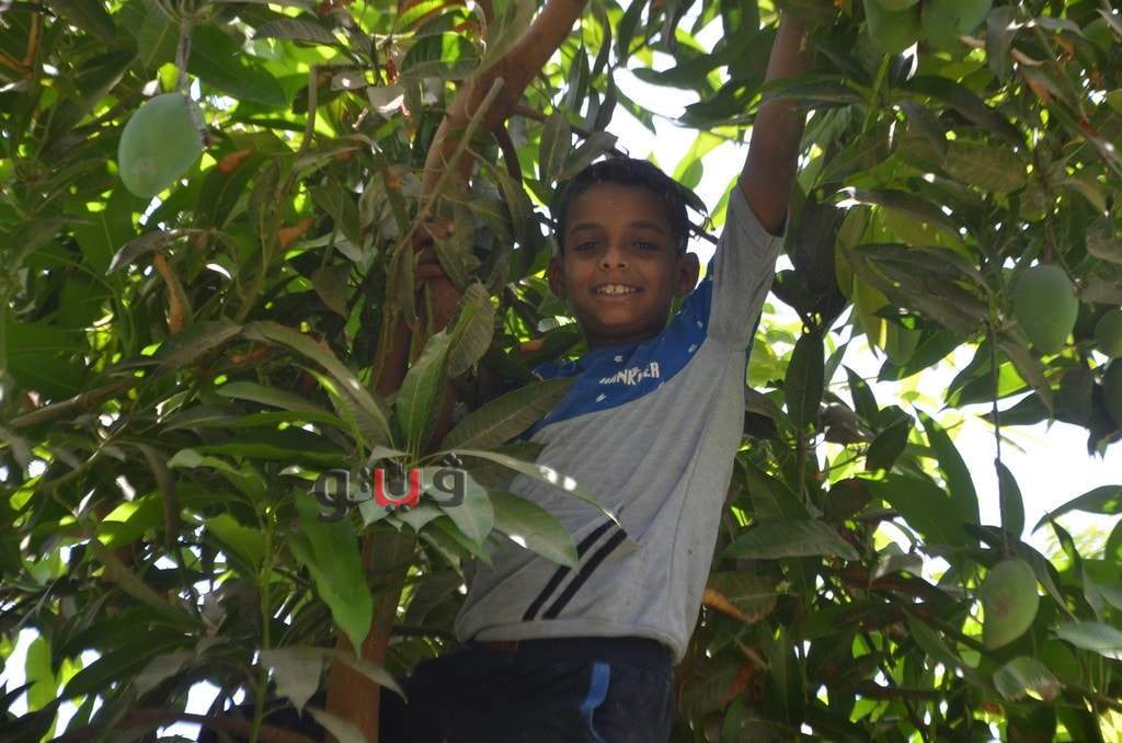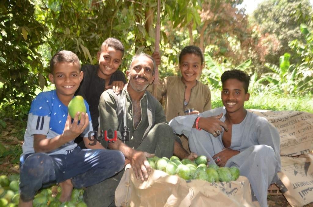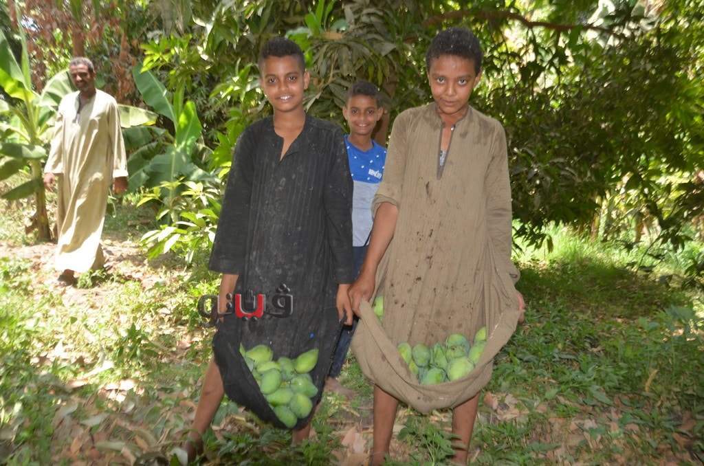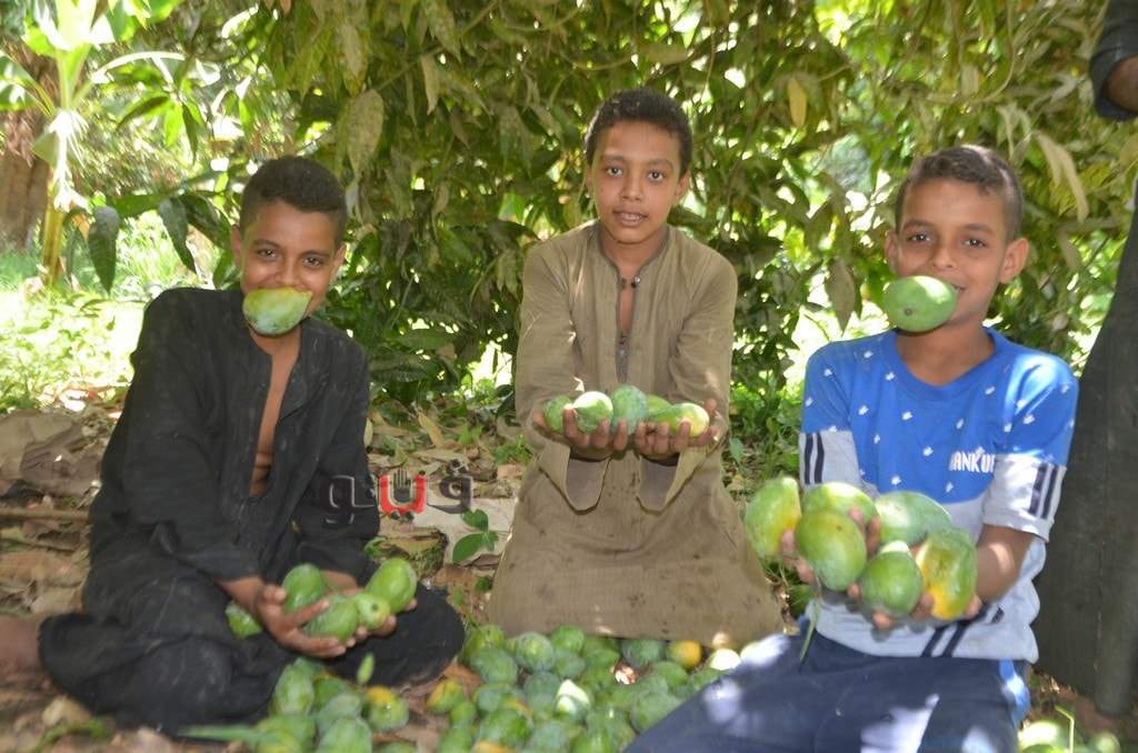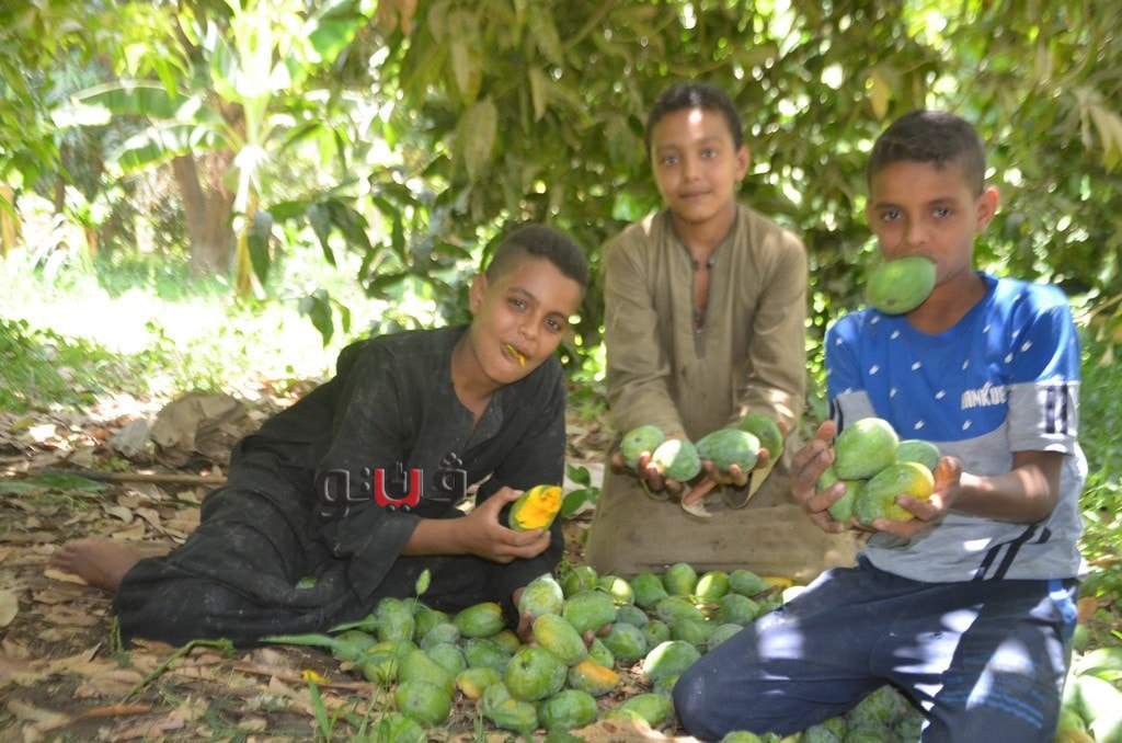وسط فرحة الأطفال بموسم الحصاد بالعمل وتناول المانجو فى قلب الأشجار وبدء توريدها للأسواق لبيعها للجمهور.
