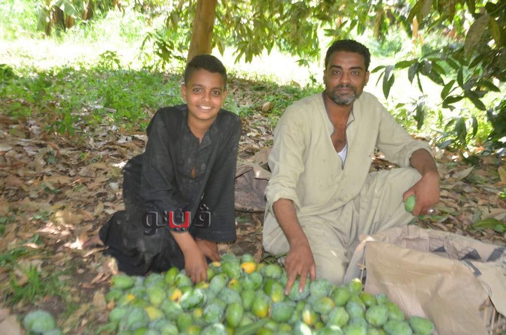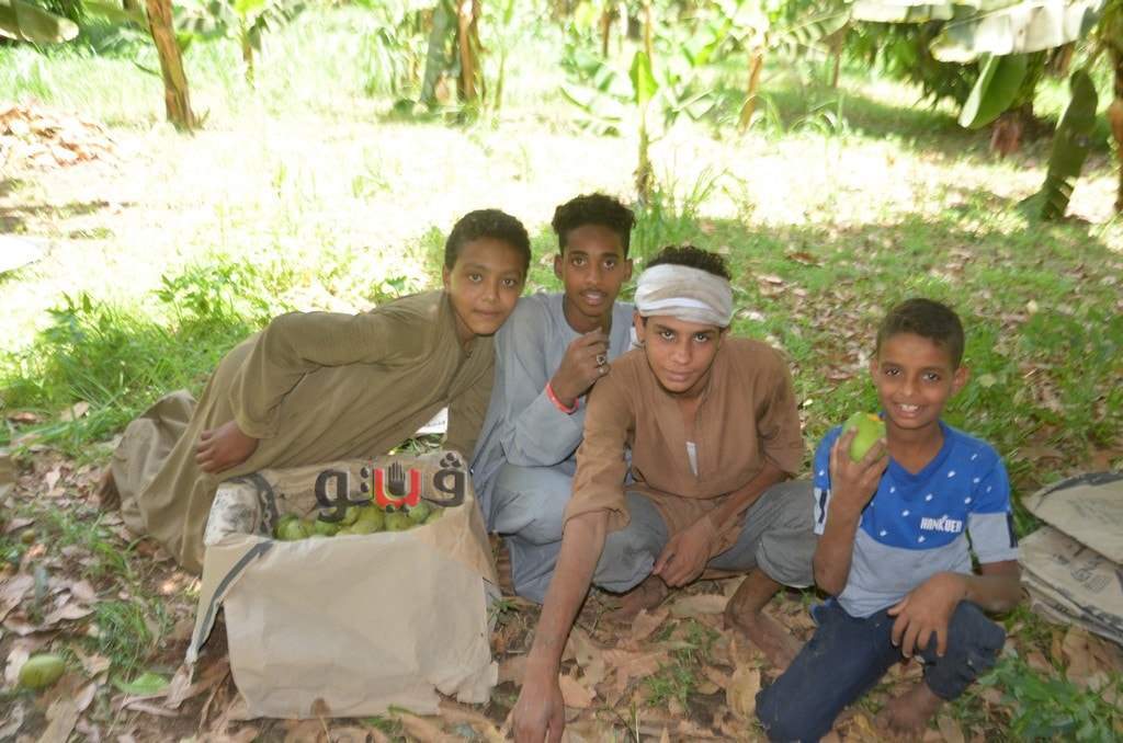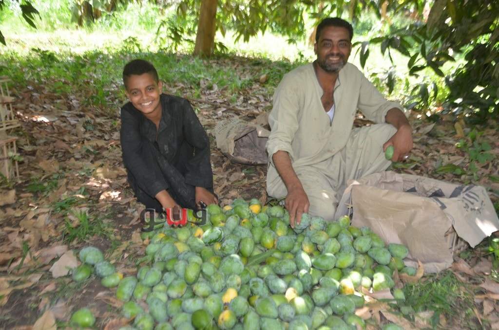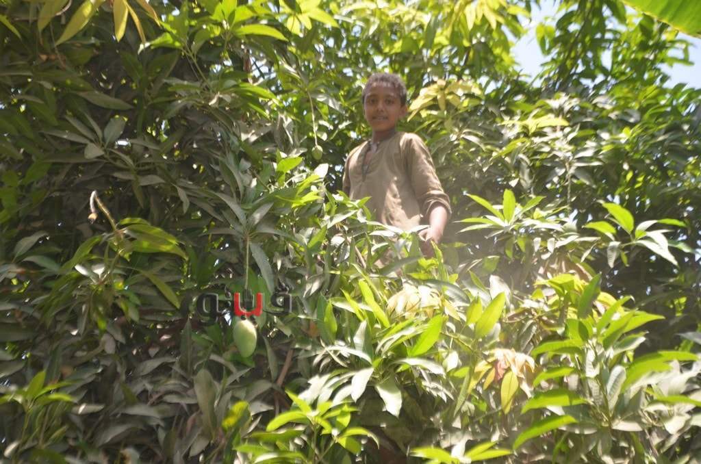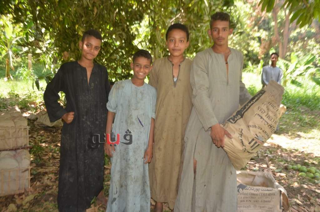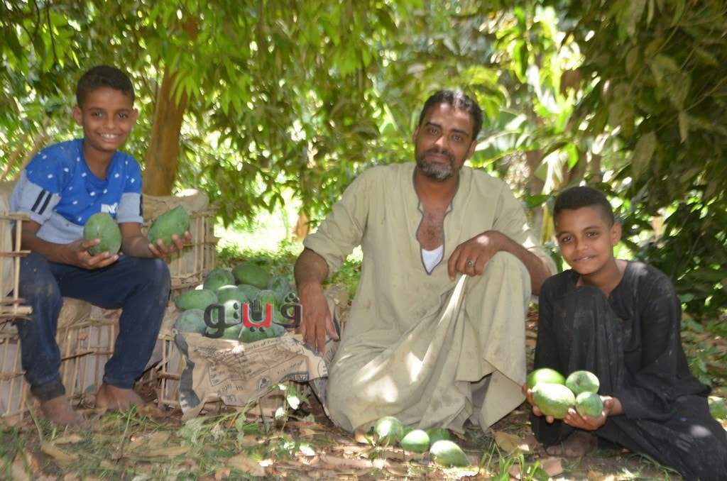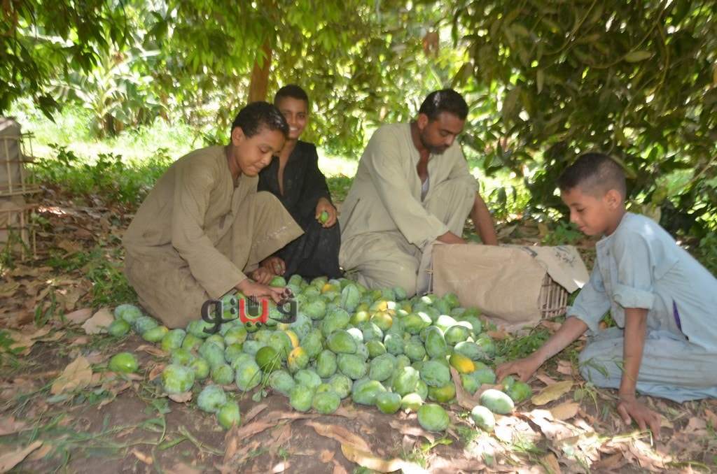 وسط فرحة الأطفال بموسم الحصاد بالعمل وتناول المانجو فى قلب الأشجار وبدء توريدها للأسواق لبيعها للجمهور.