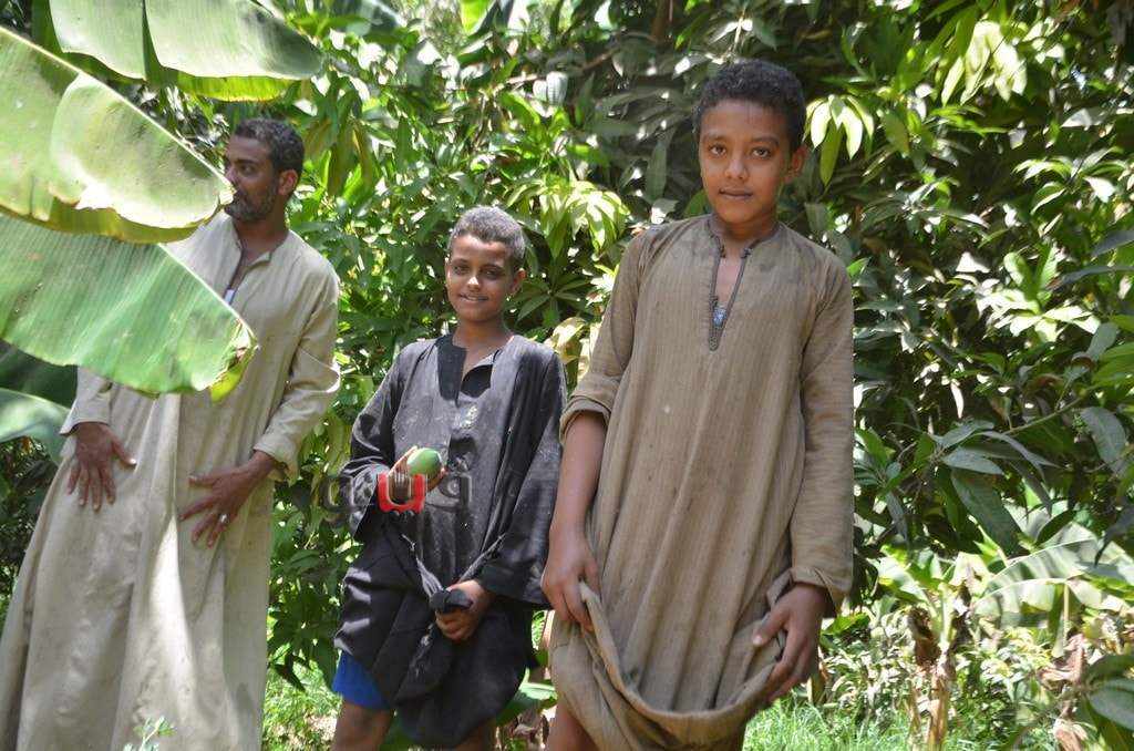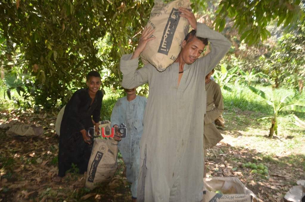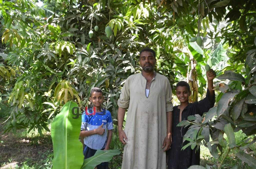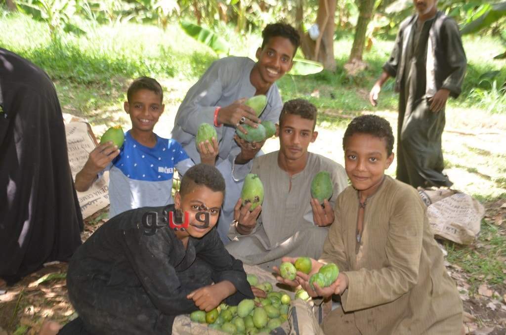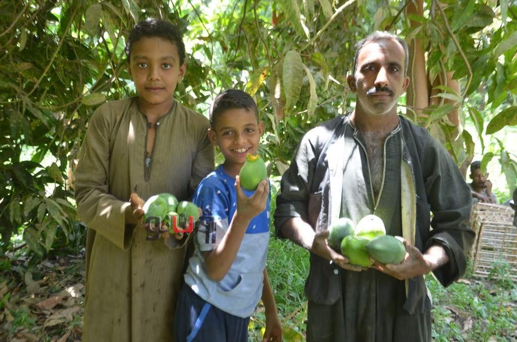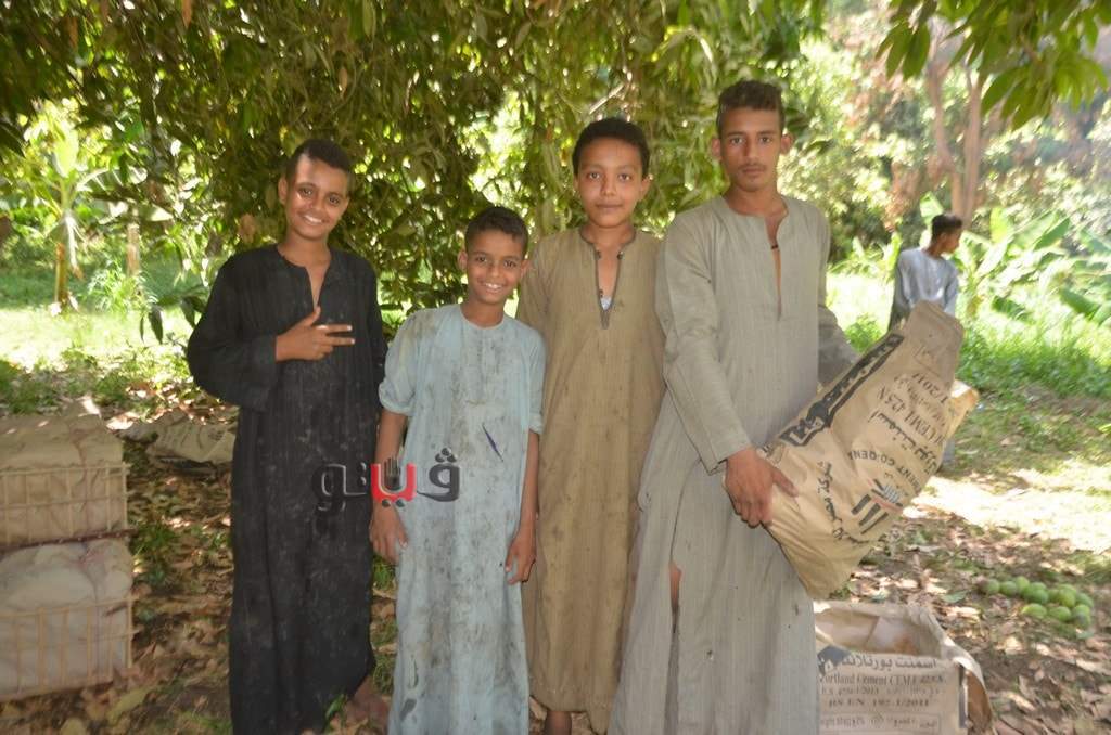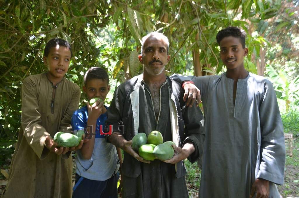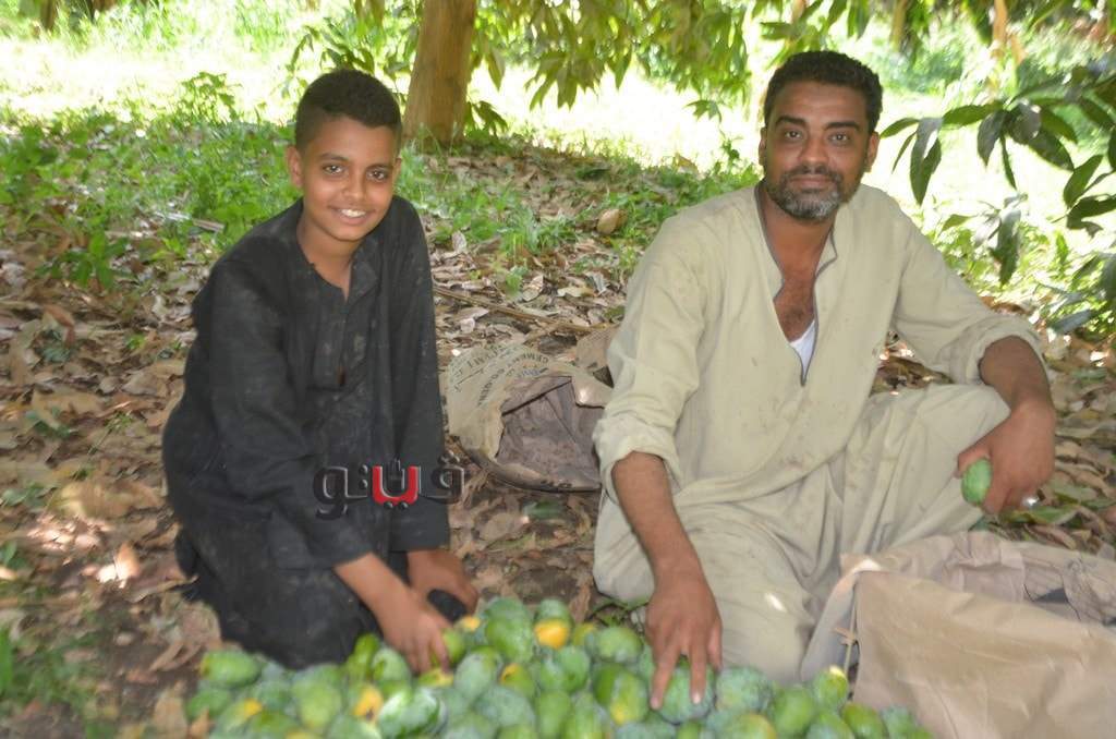 وسط فرحة الأطفال بموسم الحصاد بالعمل وتناول المانجو فى قلب الأشجار وبدء توريدها للأسواق لبيعها للجمهور.