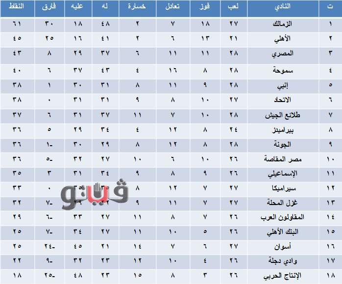 تنشر فيتو ترتيب جدول الدوري المصري بعد فوز الأهلي علي سموحة برباعية نظيفة في الجولة الـ 28 للمسابقة والتي جمعتهما بالإسكندرية مساء أمس الأحد.