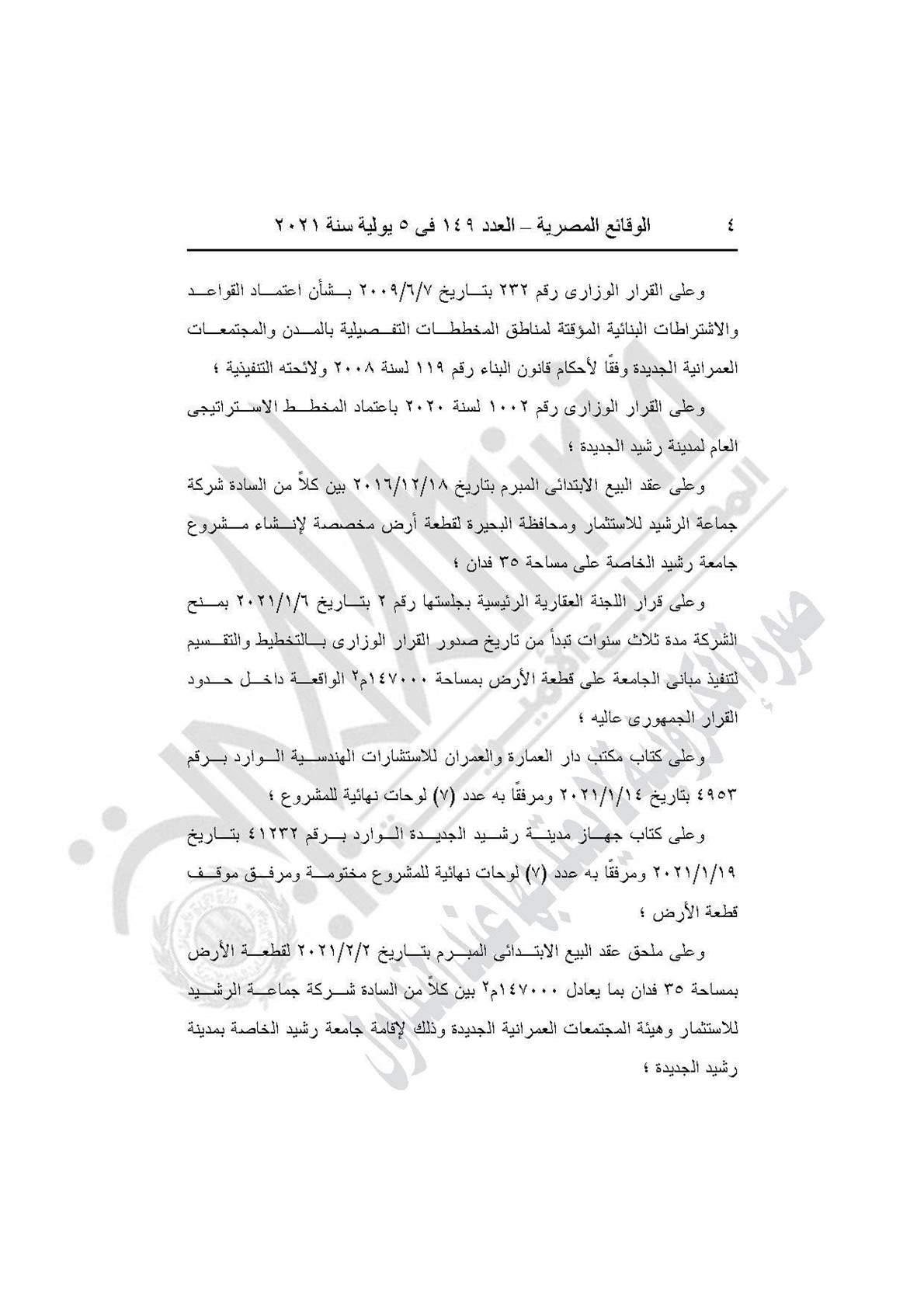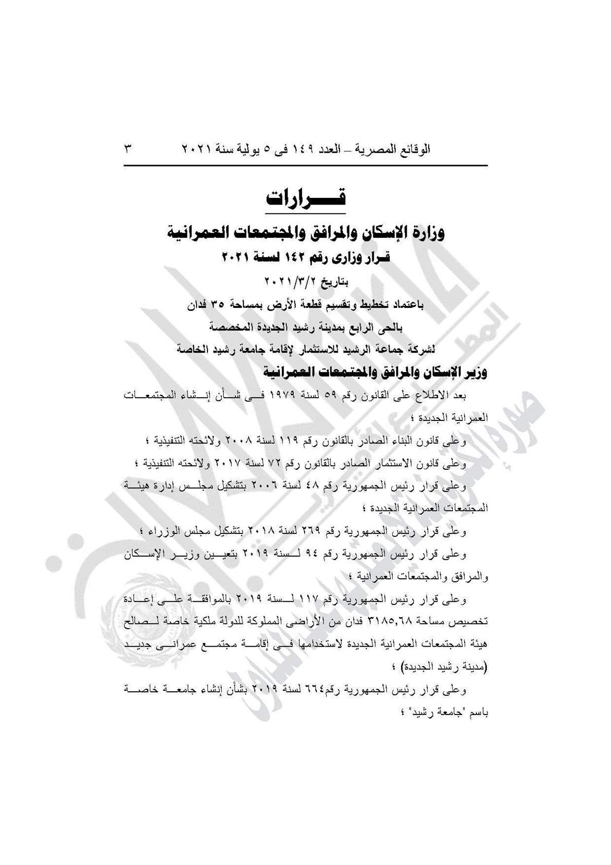 نشرت جريدة الوقائع المصرية في عددها رقم 149، الصادر في 5 يوليه 2021، قرار وزارة الإسكان والمرافق والمجتمعات العمرانية رقم 142 لسنة 2021، بشأن اعتماد تخطيط وتقسيم قطعة الأرض بمساحة 35 فدان بالحى الرابع بمدينة رشيد الجديدة المخصصة لشركة جماعة الرشيد للاستثمار لإقامة جامعة رشيد الخاصة.