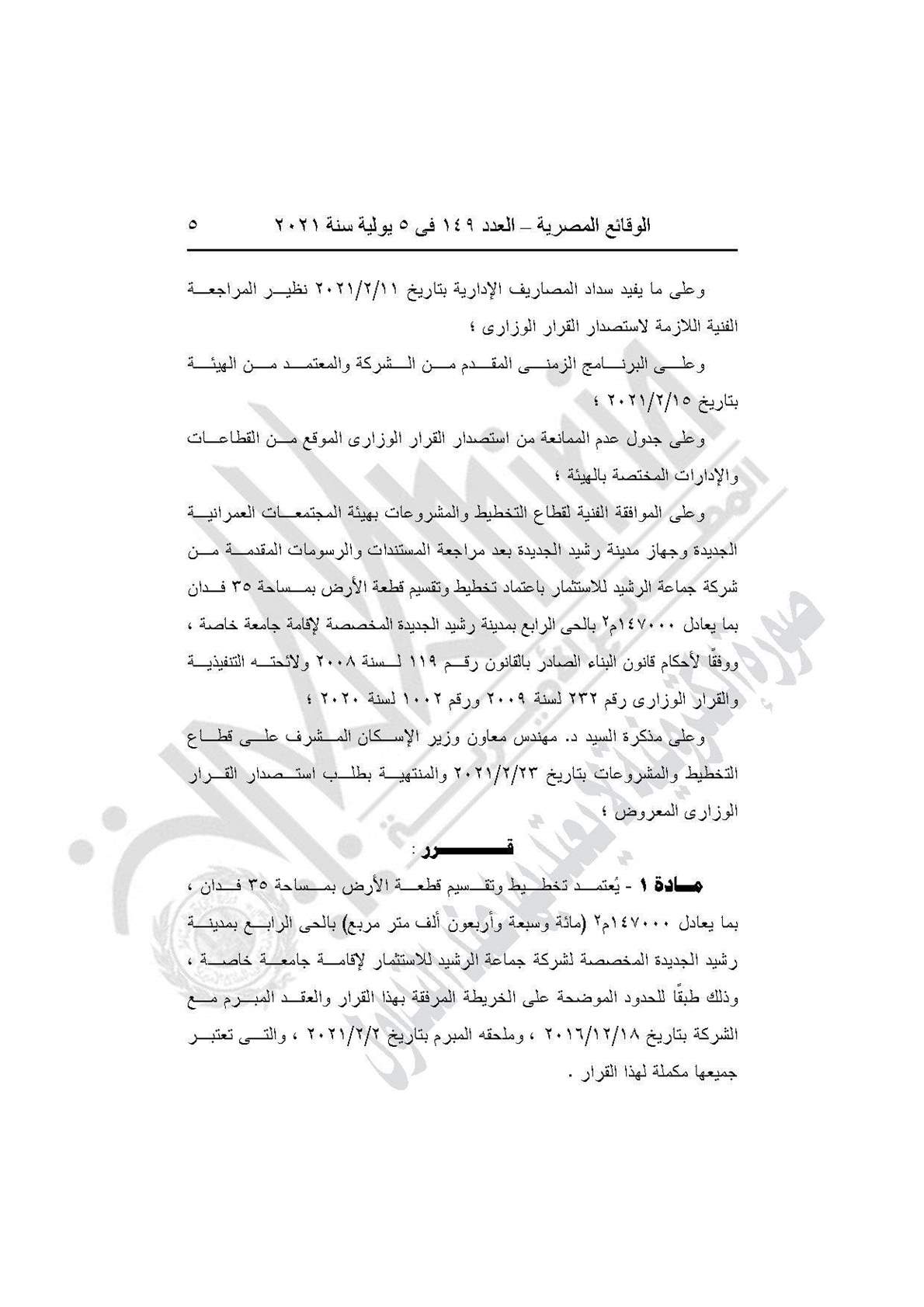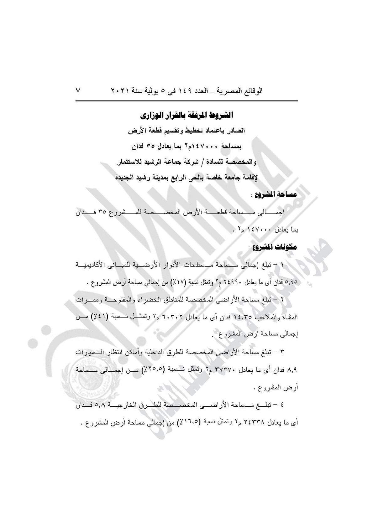 وينص القرار في مادته الأولى على اعتماد تخطيط وتقسيم قطعة الأرض بمساحة 35 فدان، بما يعادل 147000 متر مربع، بالحى الرابع بمدينة رشيد الجديدة المخصصة لشركة جماعة الرشيد للاستثمار لإقامة جامعة رشيد الخاصة، وذلك طبقًا للحدود الموضحة على الخريطة والعقد المبرم مع الشركة.