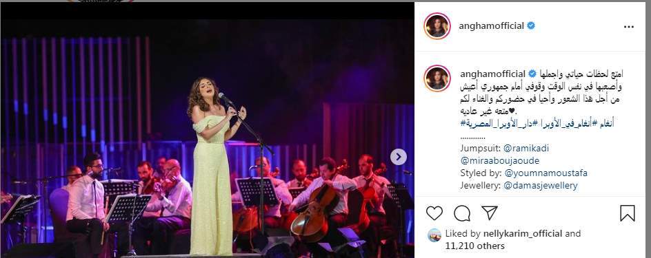 وكتبت أنغام عبر إنستجرام قائلة: "امتع لحظات حياتي واجملها وأصعبها في نفس الوقت وقوفي أمام جمهوري أعيش من أجل هذا الشعور وأحيا في حضوركم والغناء لكم متعة غير عادية".