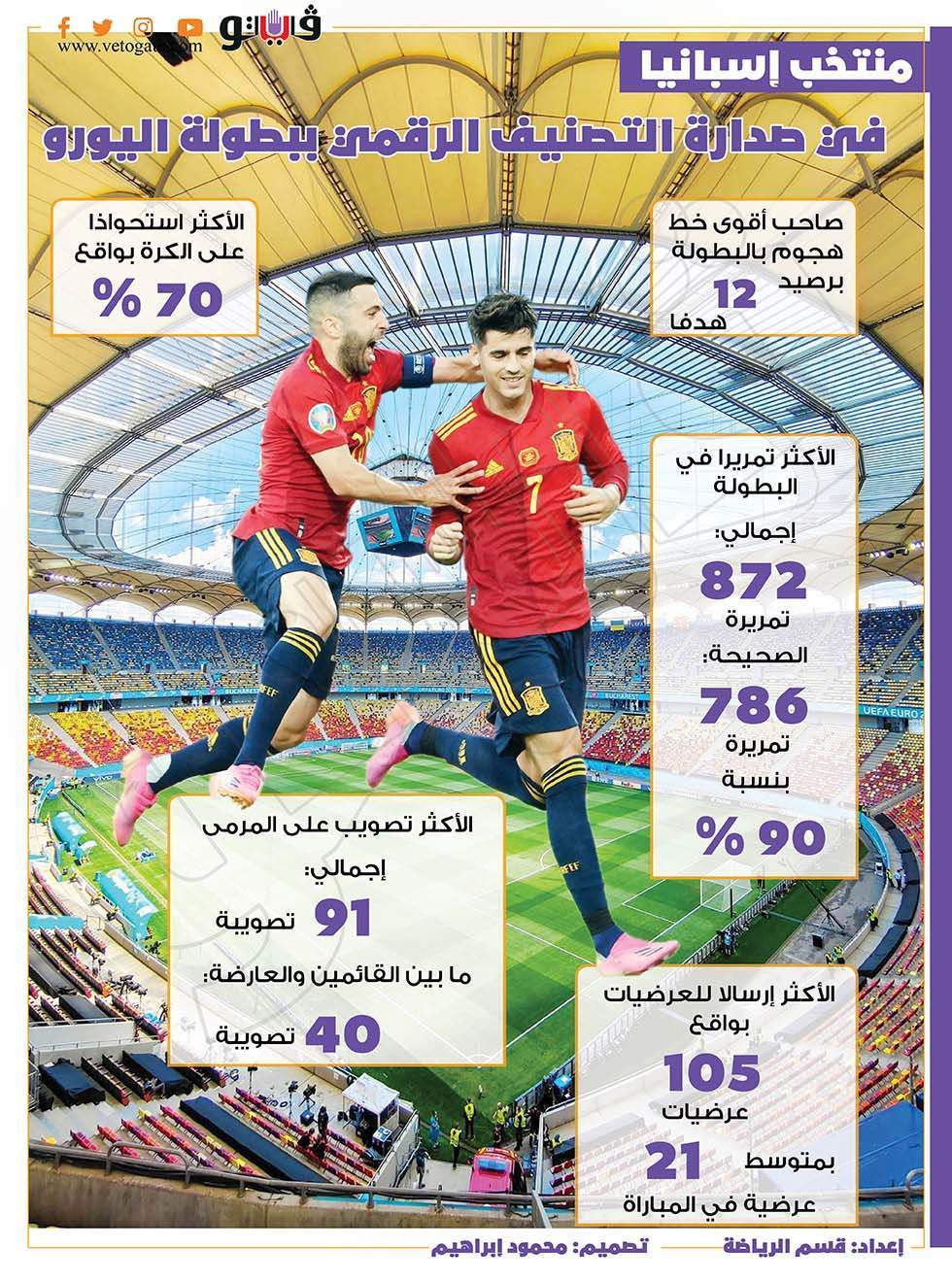 منتخب إسبانيا في صدارة التصنيف الرقمي ببطولة اليورو | إنفوجراف الأربعاء 07/يوليو/2021 - 01:33 م 7/7/2021 1:33:09 PM منتخب إسبانيا في صدارة التصنيف الرقمي ببطولة اليورو قسم الرياضة شارك طباعة 18 حجم الخط استحوذ المنتخب الإسباني على صدارة ترتيب الاحصاءات الرقمية خلال بطولة شارك طباعة يورو 2020 منتخب اسبانيا اخبار الأهلي منتخب إيطاليا رياضة فيتو
