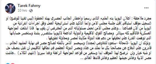 وأضاف طارق فهمي: "نؤكد أن إثيوبيا - لامحالة - ستعود للتفاوض (مجددا)، وسيحسم الأمر بأكمله لصالح مصر في نهاية المشهد الحالي.. قادرون على الدفاع عن مصالحنا بكل ما نملك من عتاد ومصر الدولة العظمي في نطاقها الإقليمي لن تقبل بنصف حل أو شبه خيار ولن نرضخ لهذا الموقف أبدا وسنغير من قواعد المواجهة الراهنة وغدا سيروا (انتهى الكلام)".