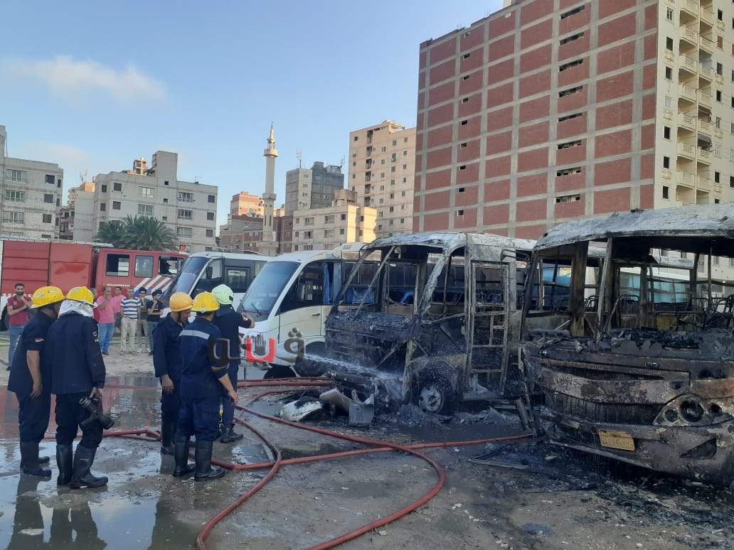 وبالمعاينة والفحص، تبين نشوب حريق بقطعة أرض فضاء تستخدم كجراج للسيارات والأتوبيسات، ما أدى إلى تفحم ٥ أتوبيسات "خاصة" بالكامل، دون إصابات.