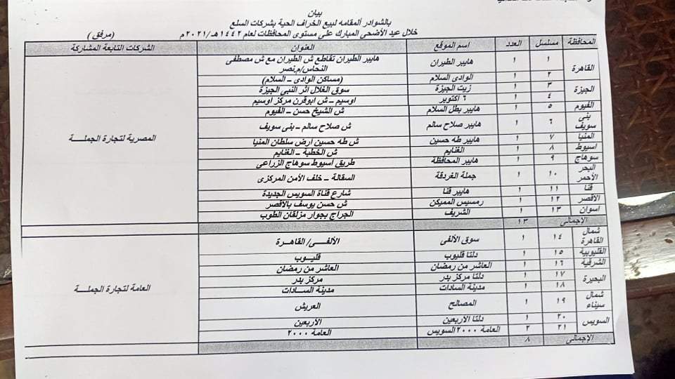 أعلنت وزارة التموين والتجارة الداخلية عن أماكن وعناوين الشوادر المقامة لبيع الخراف الحية بشركات السلع التابعة الوزارة خلال عيد الأضحى.