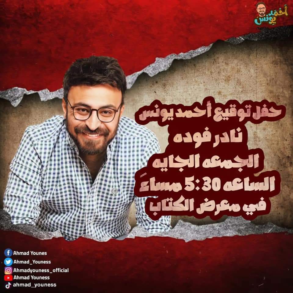 أعلن الكاتب والمذيع أحمد يونس عبر حسابه الشخصي على موقع التواصل الاجتماعي "فيس بوك" عن إقامته حفل توقيع لأعماله، وذلك يوم الجمعة المقبل في معرض القاهرة الدولي للكتاب بدورته ال52.
