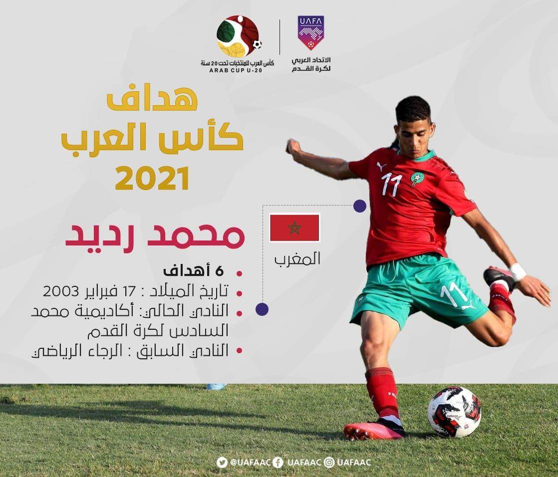 توج اللاعب محمد رديد مهاجم منتخب المغرب بلقب هداف كأس العرب للشباب 2021 والتي إختتمت بالقاهرة مساء اليوم.