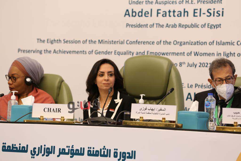 فيما وجه السفير إيهاب فوزى نائب المديرة التنفيذية لمنظمة تنمية المرأة بالشكر لجمهورية مصر العربية لاستضافتها الدورة الثامنة للمؤتمر الوزارى لمنظمة التعاون الإسلامي للمرأة و للدكتورة مايا مرسي رئيسة المجلس القومي للمرأة ورئيسة الدورة الثامنة للمؤتمر الوزاري لمنظمة التعاون الإسلامي، و الدكتور يوسف العثيمين الأمين العام لمنظمة التعاون الإسلامي ، مشيراً إلى دور مصر المحورى فى الاهتمام بقضايا المرأة حيث لم تكتف مصر بتوفير مقر المنظمة فقط ولكن أصدر السيد الرئيس عبد الفتاح السيسي العديد من التوجيهات لتذليل كافة العقبات أمام بدء عمل المنظمة منها تسديد حصة مساهمات الدول الاقل نمواً وعددها 22 دولة سواءا التى صادقت على النظام الأساسي وانضمت بالفعل أو التى لم تصادق وفى طريقها للانضمام ، متمنياً ان تشهد الاجتماعات القادمة انضمام المزيد من الدول إلى منظمة تنمية المرأة.