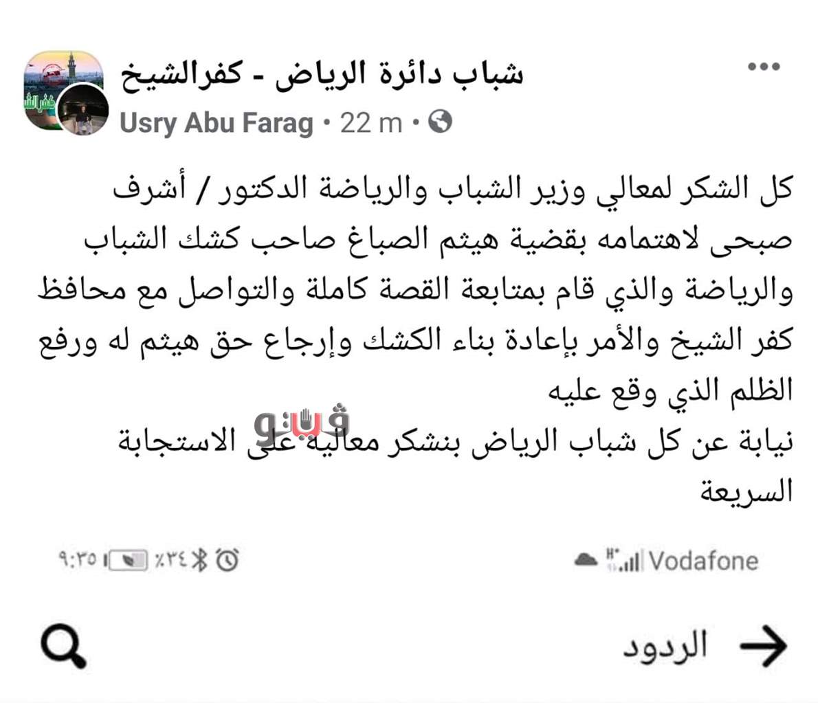 وتواصل وزير الشباب والرياضة مع محافظ كفر الشيخ لإنهاء تلك المشكلة ، وإعادة بناء الكشك مرة أخرى.
