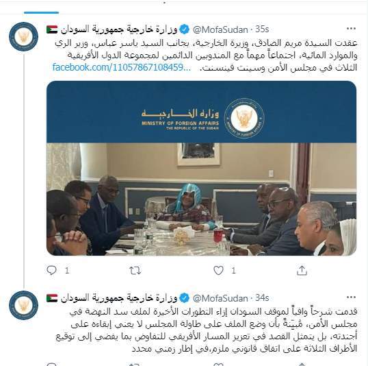 كما عقدت مريم الصادق، وزيرة الخارجية السودانية، بجانب ياسر عباس، وزير الري والموارد المائية، اجتماعاً وصف بالمهم مع المندوبين الدائمين لمجموعة الدول الأفريقية الثلاث في مجلس الأمن وسينت فينسنت بشأن ملف سد النهضة.