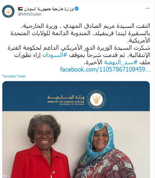 كما التقت مريم الصادق، وزيرة خارجية السودان، بالمندوبة الدائمة للولايات المتحدة الأمريكية بالسفيرة ليندا قرينفيلد، المندوبة الدائمة للولايات المتحدة الأمريكية.