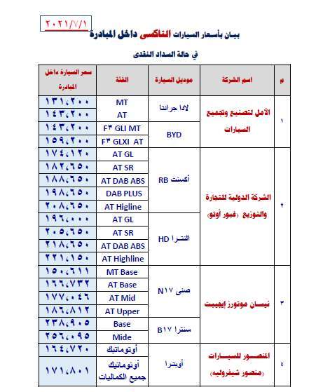 وأكدت المبادرة، أنه تم البدء رسمياً في تسليم السيارات الجديدة موديل 2022 من الشركات المشاركة في المبادرة مع تطبيق الأسعار الجديدة للسيارات موديل 2022 على إجمالي مبلغ التقسيط شامل سعر السيارة وقيمة وثائق التأمين.