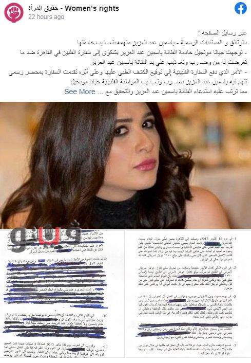 وأثارت صفحة تدعي حقوق المرأة، حالة من الجدل عبر “فيسبوك” ومهتمة بحقوق المرأة والدفاع عنها ضد العنف الذي تتعرض له، بعدما نشرت رسائل وصلت لهم من أحد الأشخاص، تفيد باتهام النجمة ياسمين عبدالعزيز بتعذيب خادمتها.