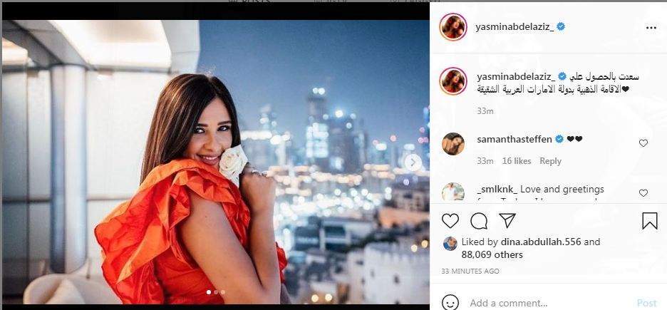 ونشرت ياسمين عدة صور لها برداء أحمر اللون من دبي، عبر حسابها الشخصي على انستجرام، وعلقت: “سعدت بالحصول على الإقامة الذهبية بدولة الإمارات العربية الشقيقة”.