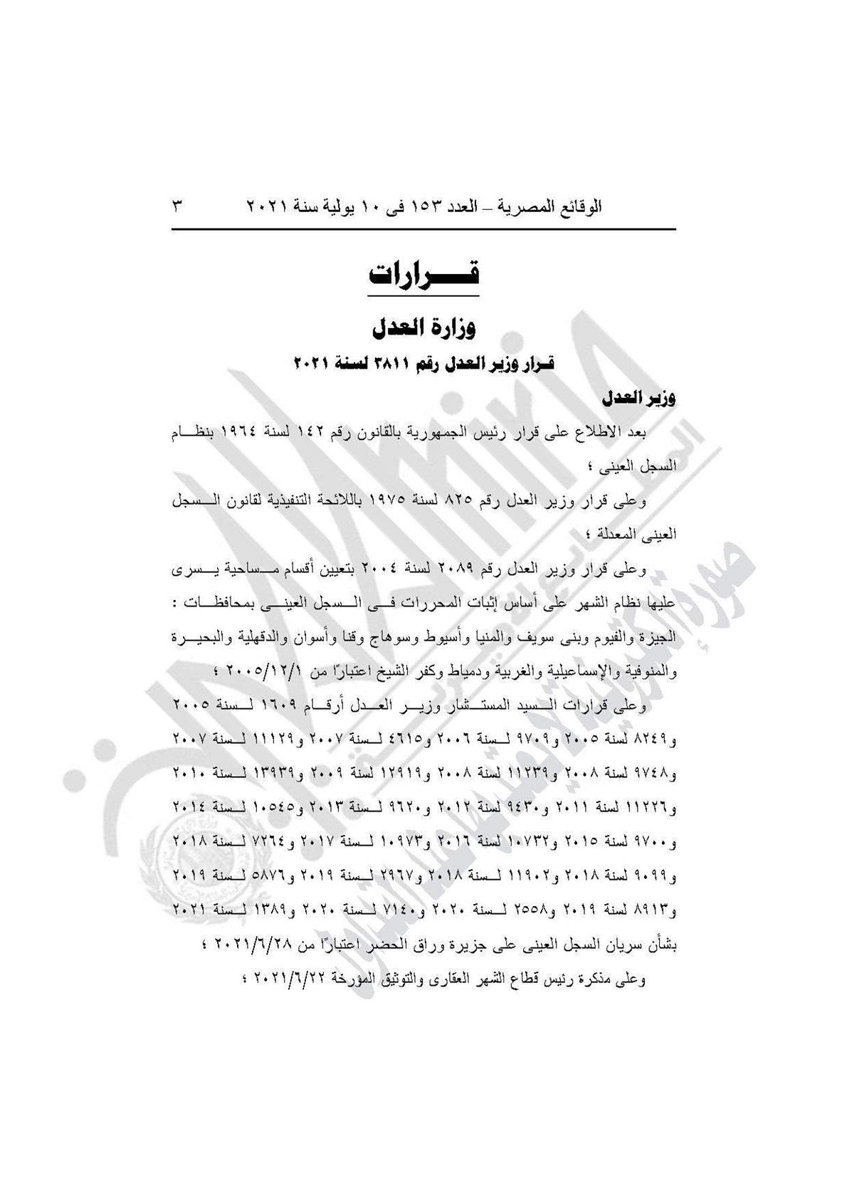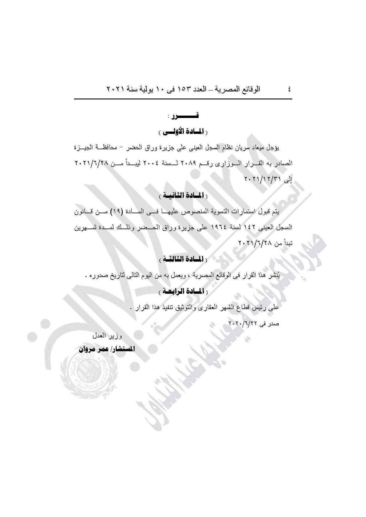 نشرت جريدة الوقائع المصرية في عددها رقم 153، الصادر في 10 يولية 2021، قرار وزير العدل المستشار عمر مروان، رقم 3811 لسنة 2021، بشأن تأجيل ميعاد سريان نظام السجل العيني على جزيرة وراق الحضر.