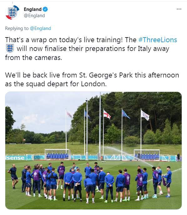 وكتب منتخب إنجلترا تغريدة على تويتر "بث مباشر من حديقة سانت جورج! تناغم حيث يكمل الأسود الثلاثة تحضيراتهم استعدادًا لنهائي اليورو 2020" .