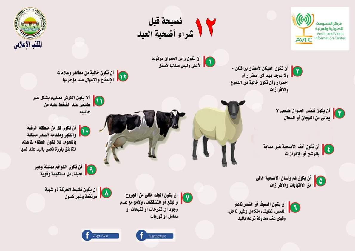 تقدم وزارة الزراعة واستصلاح الاراضي، ممثلة في مركز المعلومات الصوتية والمرئية والمكتب الاعلامي للوزارة، روشتة للمواطنين تشمل ١٢ نصيحة يجب مراعاتها قبل شراء اضحية العيد، وهي كالتالي: