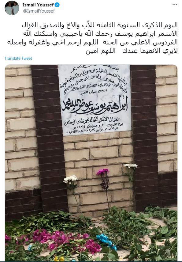وكتب إسماعيل يوسف تغريدة على تويتر "اليوم الذكرى السنوية الثامنه للأب والاخ والصديق الغزال الاسمر ابراهيم يوسف رحمك الله ياحبيبي واسكنك الله الفردوس الاعلي من الجنه اللهم ارحم اخي واغفرله واجعله لايري الانعيما عندك اللهم امين"