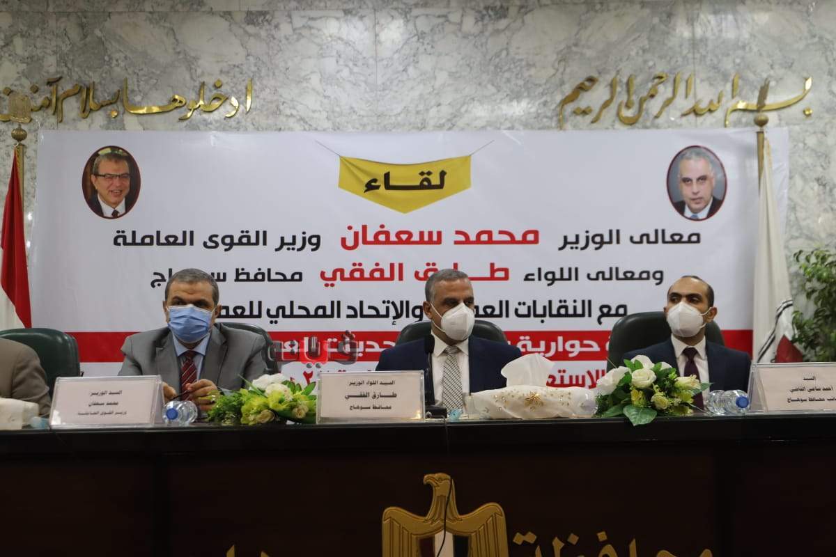 كما استمع الوزير لمشكلات العمل النقابي في سوهاج، وتقديم الحلول اللازمة لمواجتها كما حددها القانون واللائحة التنفيذية له، مع التأكيد على أن العمل النقابي عمل بدون اجر لخدمة عملية الإنتاج وخدمة العمال وأصحاب العمل والوفاء بمطالبهم، ووجه بعمل ندوات توعية لمساعدة أبناء محافظة سوهاج وعقد مؤتمرات جماهيرية للتعريف بدور القوى العاملة واتحادات العمال ودورها في خدمة العمال.