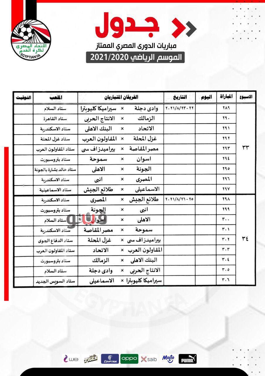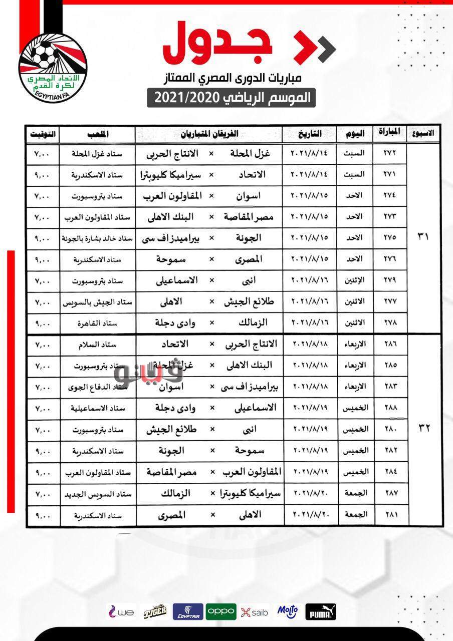 أما مباراة الزمالك أمام سيراميكا كليوباترا فى الجولة 32 فقد تقرر إقامتها يوم 20 أغسطس، فى السابعة مساء باستاد السويس الجديد، وهي التي كان محددا إقامتها أحد يومي 18 و19 أغسطس.