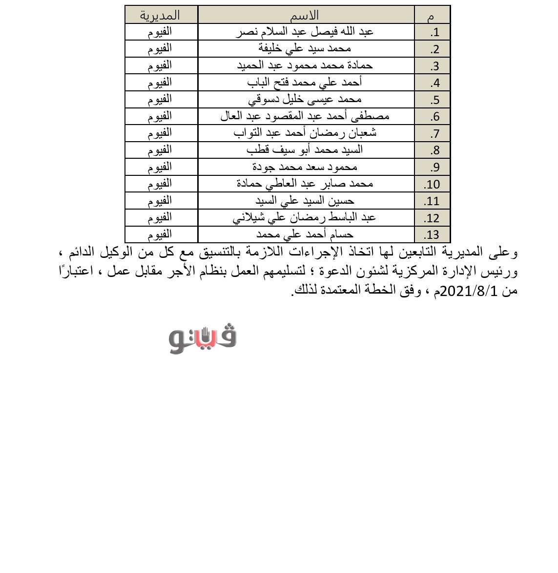 أعلنت وزارة الأوقاف أسماء خطباء المكافأة على بند التحسين نظام الأجر مقابل عمل الذين اجتازوا المقابلة بنجاح من محافظة الفيوم ، وهم:
