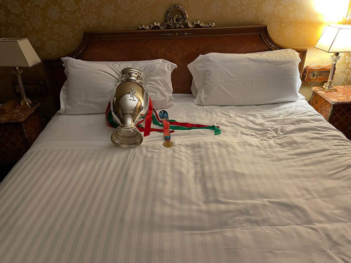 ونشر قائد المنتخب الإيطالي، جورجيو كيليني، على مواقع التواصل الاجتماعي، صورة للكأس موضوعة على السرير في غرفته بالفندق.