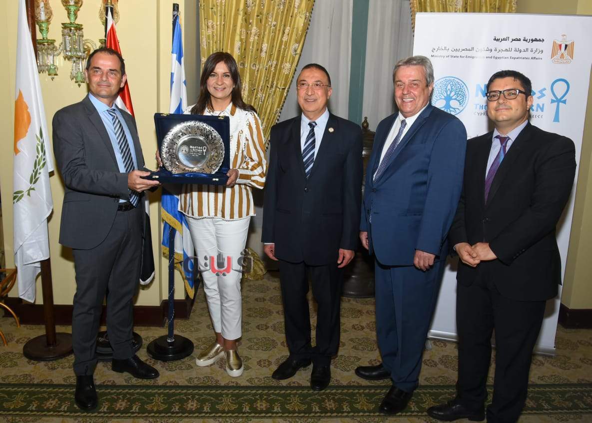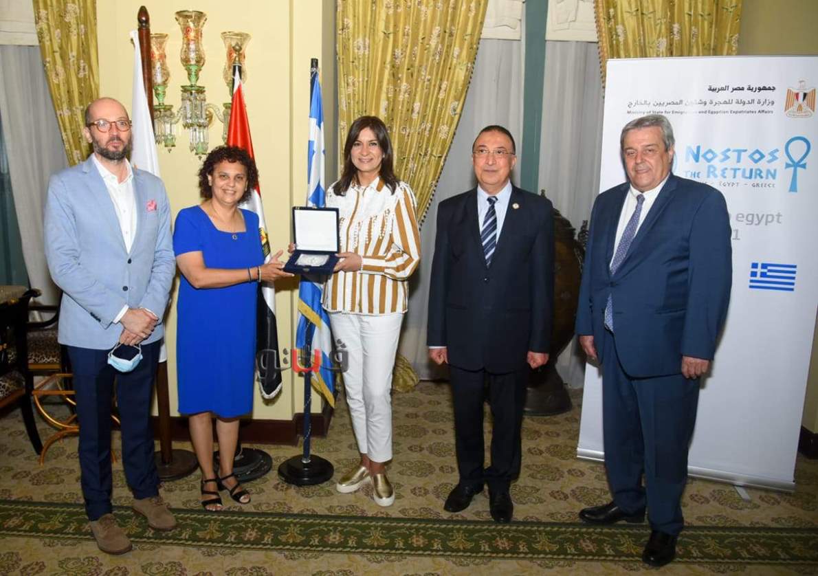 وعلى صعيد متواصل، كرمت السفيرة نبيلة مكرم ممثلي الجاليتين القبرصية واليونانية، وأهدت لهم درع المبادرة الرئاسية "إحياء الجذور.. Nostos"، كما قام ممثلان من الجاليتين اليونانية والقبرصية بإهداء وزيرة الهجرة درع الجاليتين.
