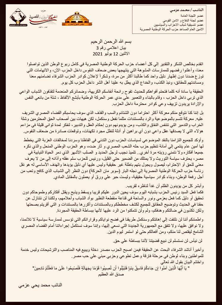 وأضاف عزمي في بيانه: شكراً لإعلان كوادر الحزب الشرفاء تضامنهم معنا ومساندتهم للحقائق، ونبذ الكذب، والخداع الذي يطل به علينا أهل الشر داخل الحزب كل يوم، مشيرا أنه كلما فتحتم أفواهكم للرد عينا تفوح رائحة أنفاسكم الكريهة، وضمائركم المنعدمة لتقذفون الشباب الواعي الذي تربي داخل الحزب معكم، وقام بالبناء والتعمير على مدى عمر الحركة الوطنية بأبشع الألفاظ، شلة من بائعي النفس والإرادة يريدون تزييف وعي كوادر محترمة داخل الحزب.