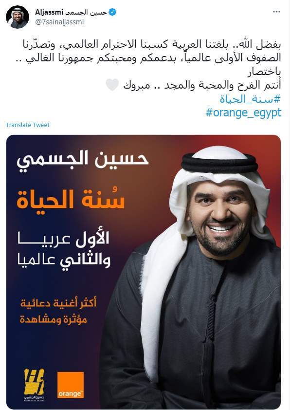 "بفضل الله.. بلغتنا العربية كسبنا الاحترام العالمي، وتصدّرنا الصفوف الأولى عالمياً، بدعمكم ومحبتكم جمهورنا الغالي.. باختصار أنتم الفرح والمحبة والمجد .. مبروك #سنة_الحياة".