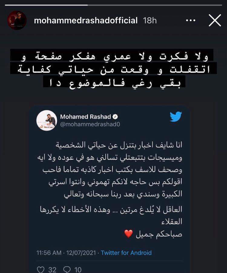 من جانبه، نفى الفنان محمد رشاد الأخبار التي تم تداولها عن عودته لطليقته الإعلامية مي حلمي، وكتب عبر خاصية "ستوري" عبر "إنستجرام":" ولا فكرت ولا عمري هفكر صفحة واتقفلت وقعت من حياتي كفاية بقى رغي في الموضوع ده".
