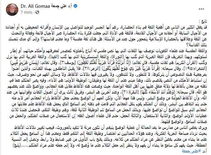 وكتب علي جمعة تدوينة على الفيس بوك قال فيها: "قد يغفل الكثير من الناس عن أهمية اللغة في بناء الحضارة، رغم أنها الجسر الوحيد للتواصل بين الإنسان وأقرانه المحيطين به أو أجداده من الأجيال السابقة أو أحفاده من الأجيال القادمة، فاللغة هي الأداة التي جعلت فكرة بناء الحضارة عبر الأجيال قائمة وفعالة والتحدث عن اللغة وعلاقتها بالحضارة الإسلامية يتمحور حول عدد من الأسئلة: هل هناك لغة مقدسة؟ وما معنى قداستها؟ وإلى أي مدى نتمسك بتلك القداسة؟".