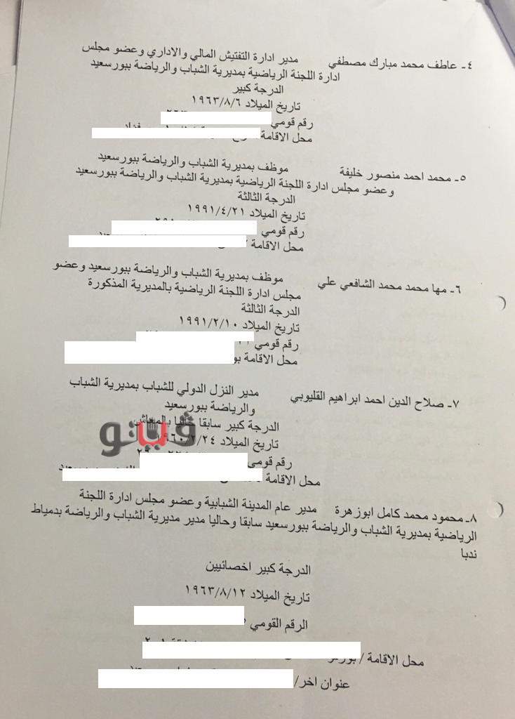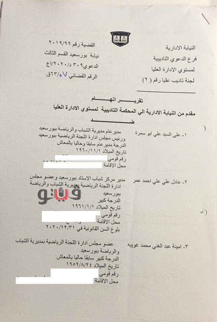 تقرير الاتهام شمل كلًا من رئيس وأعضاء مجلس إدارة اللجنة الرياضية ببور سعيد، وهم علي السيد أبو سمرة، مدير مديرية الشباب والرياضة وعادل علي عمر، مدير مركز شباب الإستاد وأمينة عبد الغني محمد، كبير باحثين وعاطف محمد مبارك، مدير إدارة التفتيش المالي والإداري ومحمد أحمد منصور ومها محمد الشافعي، الموظفين بمديرية الشباب والرياضة وصلاح أحمد إبراهيم، مدير النزل الدولي للشباب ومحمود محمد كامل، مدير عام المدينة الشبابية سابقًا وحاليًا مدير مديرية الشباب والرياضة بدمياط وعبد الناصر محمد خليل، مدير الشئون المالية وأمين صندوق اللجنة الرياضية.