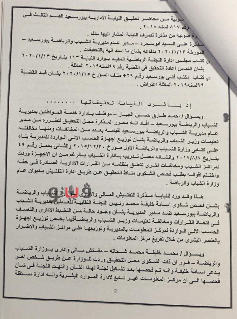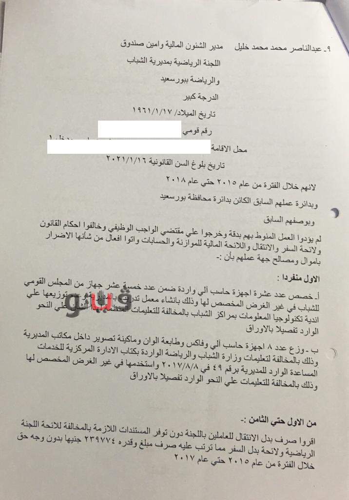 وورد للنيابة مذكرة التفتيش المالي والإداري بوزارة الشباب والرياضة بشأن فحص شكوى أسامة خليفة محمد، رئيس اللجنة النقابية للعاملين بمديرية الشباب والرياضة ببورسعيد ضد مدير المديرية بشأن وجود حالة من التخبط الإداري والتعسف في اتخاذ القرارات ومخالفة تعليمات وزير الشباب والرياضة، وأنتهت التحقيقات إلى إحالة المخالفين التسعة للمحاكمة العاجلة.