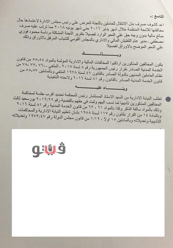 وتبين أن المحالين من الأول حتى الثامن أقروا صرف بدل الانتقال للعاملين باللجنة دون توافر المستندات اللازمة بالمخالفة للائحة اللجنة الرياضية ولائحة بدل السفر مما ترتب عليه الصرف بدون وجه حق خلال الفترة من عام 2015 حتى عام 2017.
