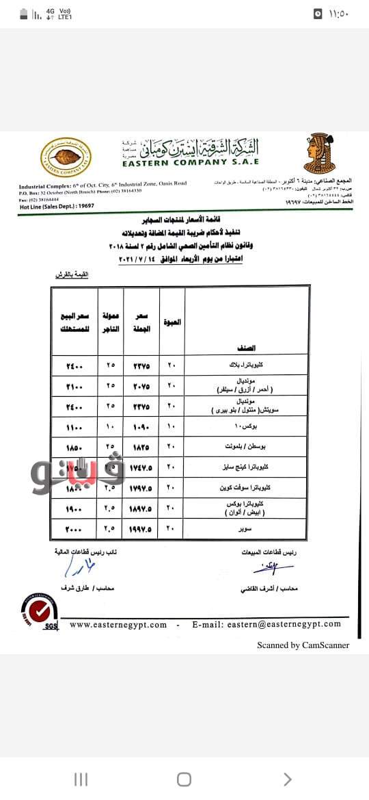 أعلنت الشركة الشرقية للدخان قائمة الأسعار الجديدة لمنتجات السجائر تنفيذا لأحكام ضريبة القيمة المضافة وتعديلاته وقانون نظام التأمين الصحى الشامل رقم 2 لسنة 2018 اعتبارا من اليوم الأربعاء الموافق 14-7-2021.