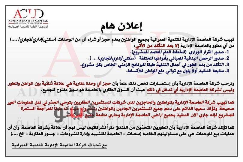 العاصمة الإدارية بعدم حجز أو شراء أي من الوحدات سكنة إداري تجاري أو غيره من أى