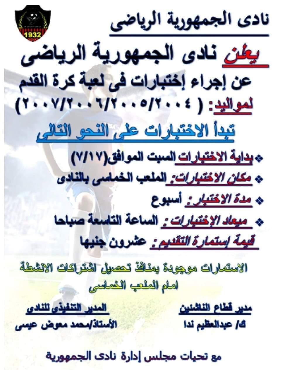 موعد اختبارات الناشئين 2021 بنادي جمهورية شبين