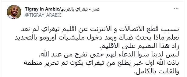 وكتب حساب تيجراي بالعربي" تغريدة على تويتر: "بسبب قطع الاتصالات والانترنت عن اقليم تيجراي لم نعد نعلم ماذا يحدث هناك وبعد دخول مليشيات اورومو بالتحديد زاد هذا التعتيم على الاقليم.. ليس لدينا سوا الدعاء لهم حتى تفرج من عند الله.. باذن الله اول خبر يطلع من تيجراي يكون تم تحرير منطقة والقايت بالكامل".