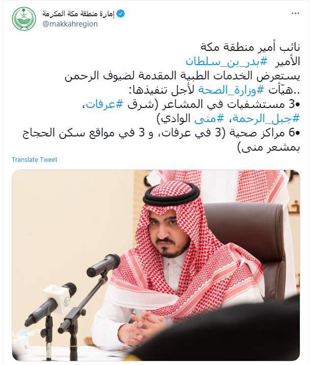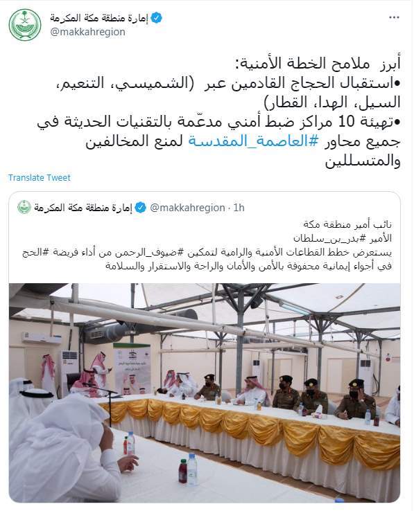 وجاء في الحساب الرسمي لإمارة مكة المكرمة عبر تويتر أن " نائب أمير منطقة مكة الأمير #بدر_بن_سلطان يستعرض خطط القطاعات الأمنية والرامية لتمكين #ضيوف_الرحمن من أداء فريضة #الحج في أجواء إيمانية محفوفة بالأمن والأمان والراحة والاستقرار والسلامة".