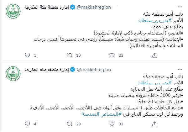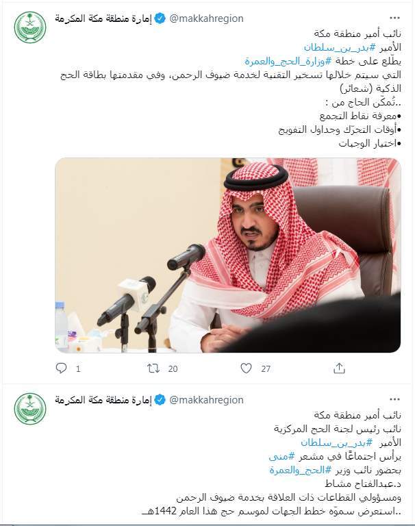 وقال الحساب إن " نائب أمير منطقة مكة الأمير #بدر_بن_سلطان يطّلع على خطط: التفويج (استخدام برنامج ذكي لإدارة الحشود).. الإعاشة (سيتم تقديم وجبات مُعدّة مسبقًا، روعي في تحضيرها أقصى درجات السلامة والمأمونية الغذائية)