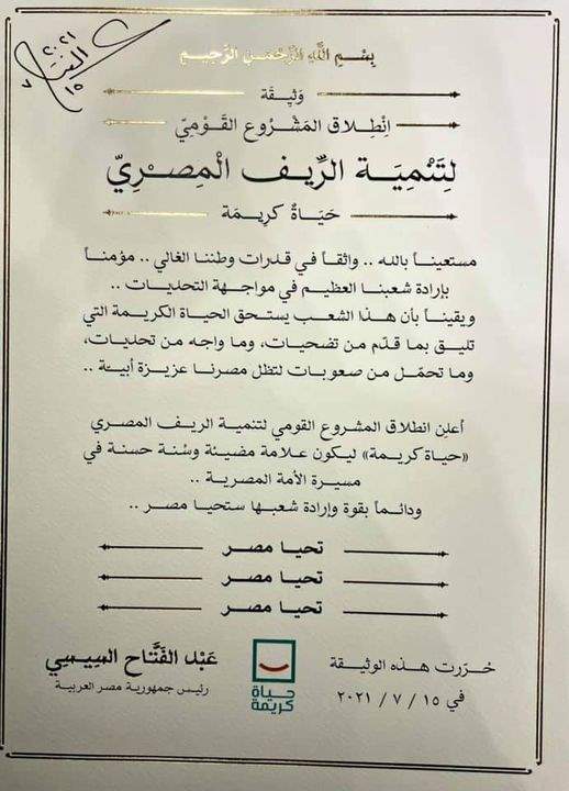 ونشر المتحدث الرسمي لرئاسة الجمهورية، صورة من توقيع الرئيس عبد الفتاح السيسى، على وثيقة انطلاق مشروع تنمية الريف المصرى "حياة كريمة".