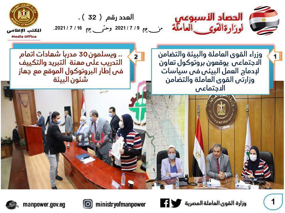 وفيما يلي تفاصيل ما جاء بالحصاد الأسبوعي، حيث وقع وزراء القوي العاملة محمد سعفان، والدكتورة ياسمين فؤاد وزيرة البيئة، ونيفين القباج وزارة التضامن الاجتماعي ، بديوان عام وزارة القوي العاملة، بروتوكول تعاون مشترك لفتح آفاق ومجالات جديدة لتفعيل إدماج العمل البيئي في سياسات وزارتي القوى العاملة والتضامن الاجتماعي ، فضلا عن تضمين مفهوم الحماية الاجتماعية في سياسات وزارة البيئة وحوكمة القطاع غير الرسمي ودمجه في منظومة الإدارة المتكاملة للمخلفات وذلك لتحقيق أهداف التنمية المستدامة 2030 .