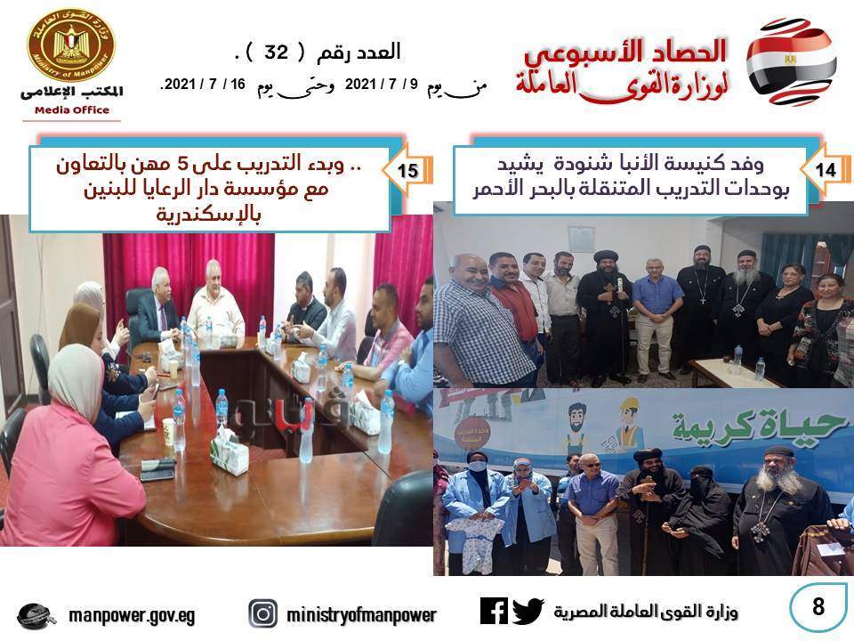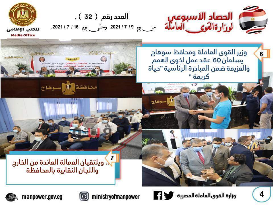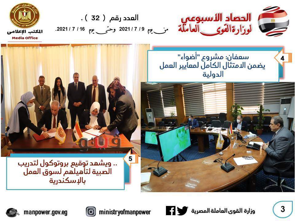 كما شهد الأسبوع الحالي منح وزير القوي العاملة محمد سعفان، العاملين بالقطاع الخاص إجازة مدفوعة الأجر من الإثنين 19 يوليو حتي الخميس 22 يوليو الجاري ، وبدء اختبارات المدربين علي 5 برامج متخصصة من خريجي كلية الهندسة قسمي (اتصالات ، وحاسبات ) ، وتحويل 4.1 ملايين جنيه مستحقات العمالة المصرية العائدة من الأردن .
