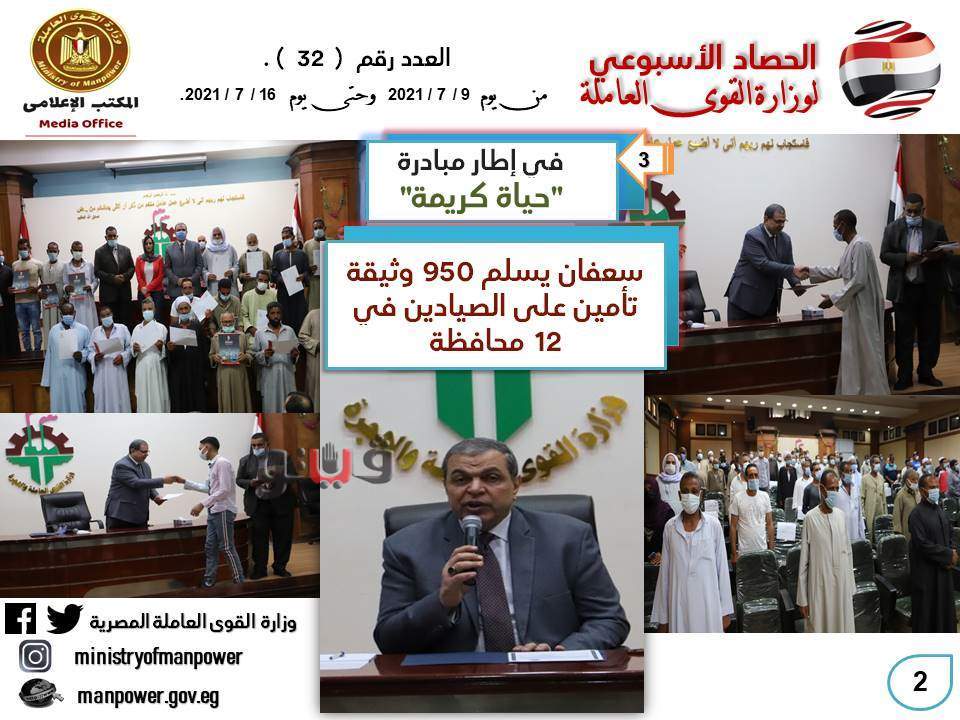وفي نفس الاسبوع سلم وزير القوى العاملة ، بديوان عام الوزارة 950 وثيقة تأمين على فئة الصيادين فى 12 محافظة ، في إطار مبادرة " حياة كريمة " التي أطلقها الرئيس عبد الفتاح السيسي .
